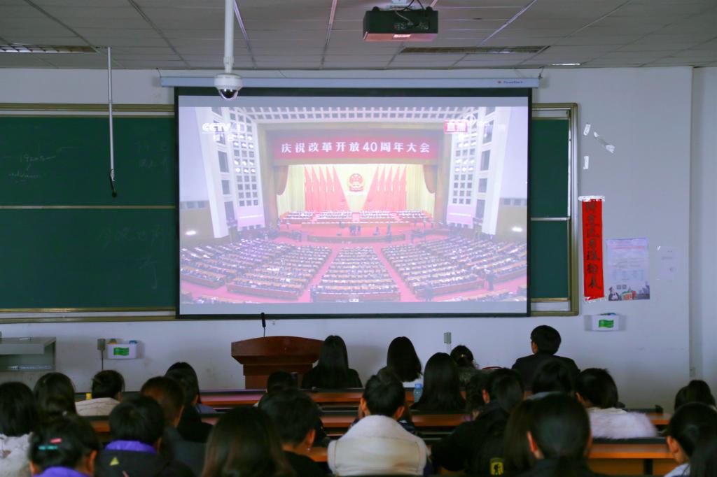 为庆祝改革开放40周年,2018年12月18日上午十点,XC体育员工代表在姬文锦、李晓慧、刘龙琳、陈德林四位老师的带领下,在一号教学楼528教室收看“庆祝改革开放40周年大会”直播,认真聆听习近平总书记在大会上的重要讲话内容。