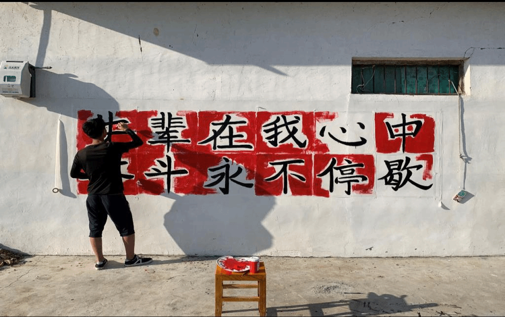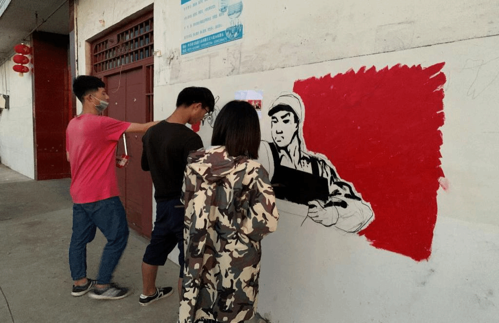 队员们手中的红色笔刷,绘画出的是他们对振兴乡村文化的美好期望,和对此次“三下乡”活动工作的热情。队员们尽己所能,不辜负每一天的付出和辛勤的汗水,为的是用他们手中的画笔,给乡亲们增加一些新活力、新气象,给村子里添上几笔靓丽的风景。到了中午时分,志愿者们完成了初步的上色阶段和对墙体的部分书写工作。回到住所后,他们吃了些简单的饭菜,稍作休息之后,便从重新回到了乡间继续开展工作。无论是阳光挥洒,还是蝇虫叮咬,都没有阻挡住志愿者前进的步伐。