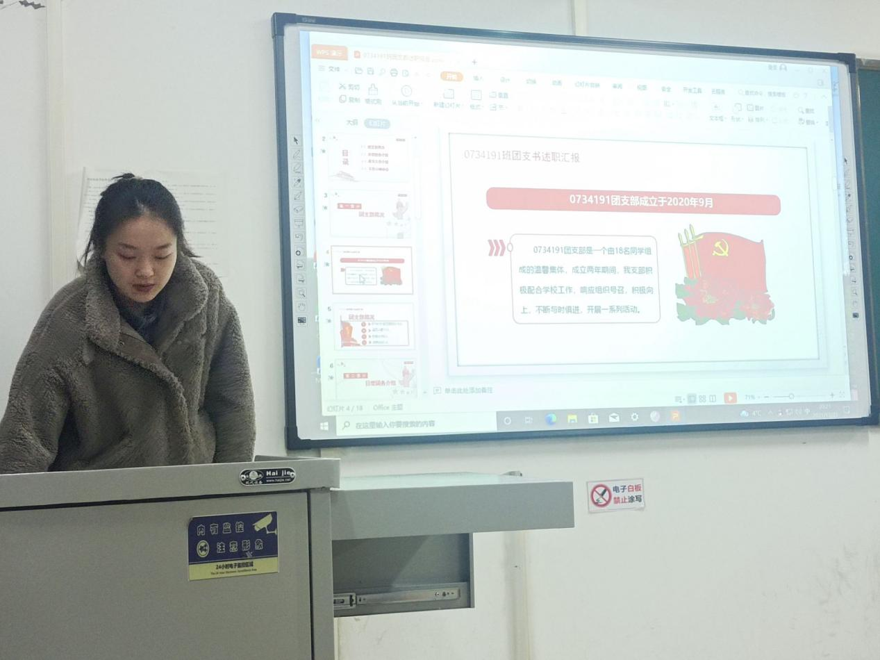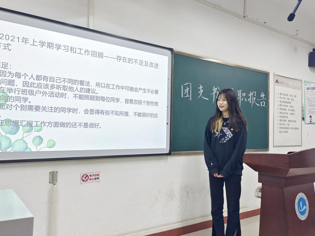 各班团支书以PPT演讲的形式,围绕“团支部组织建设”“对岗位职责的认识与认知”“团支部开展工作情况”等方面对本学年的工作进行了全面的回顾,重点对青年大学习、三会两制一课、团日活动、党史学习教育等工作进行汇报,从工作实践中总结成绩和经验,找出不足与问题,提出相应改进措施,对下一年度团支部工作进行计划和展望。