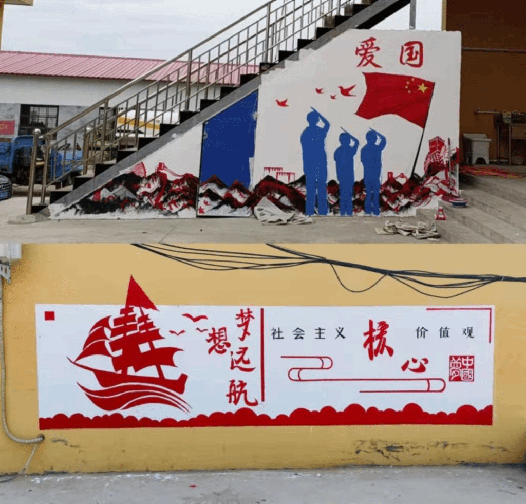 墙面处理之后,确定主题图案。随后进行起型、调色、上色等绘画步骤、绘制出完整作品。此次绘画使同学们了解更多的乡村文化,对三下乡有了更深一步的认识。同时,为宣传乡村文化献出一份绵薄之力。