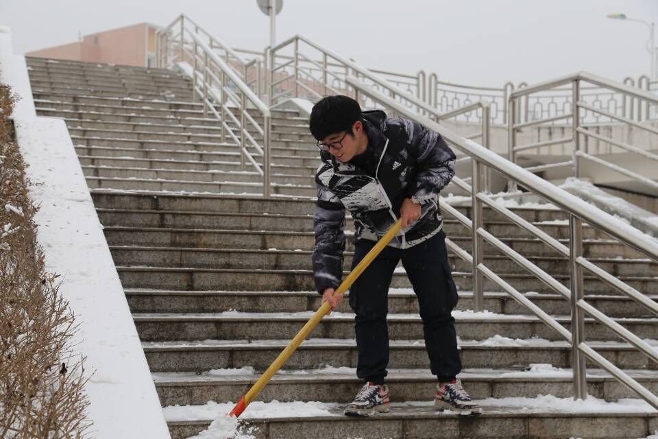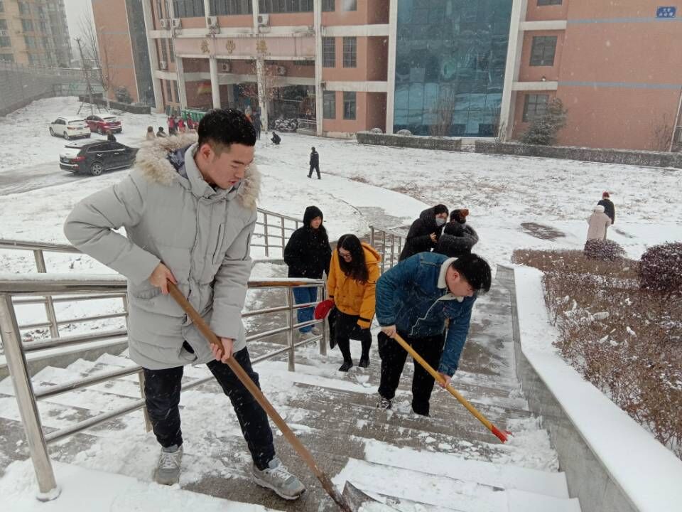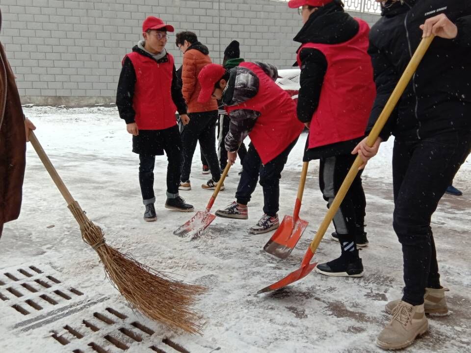 天空飘扬着飞雪,志愿服务队在教学楼前热火朝天地清除着路面的积雪。仿佛上天有意要为难这些热心的志愿服务队人员,雪越下越大,他们一个个脸冻得通红,但热情不减,没有丝毫懈怠。每个从他们身边走过的人,除了看到干净且安全的通道外,还有他们不惧风雪、服务同学始终炙热的心。刺骨的寒风丝毫没有消减志愿者们扫雪的热情,在大家的齐心协力下,功夫不负有心人,终于铲出了一条条带着温情的道路,路面的积雪终于被铲除干净了。