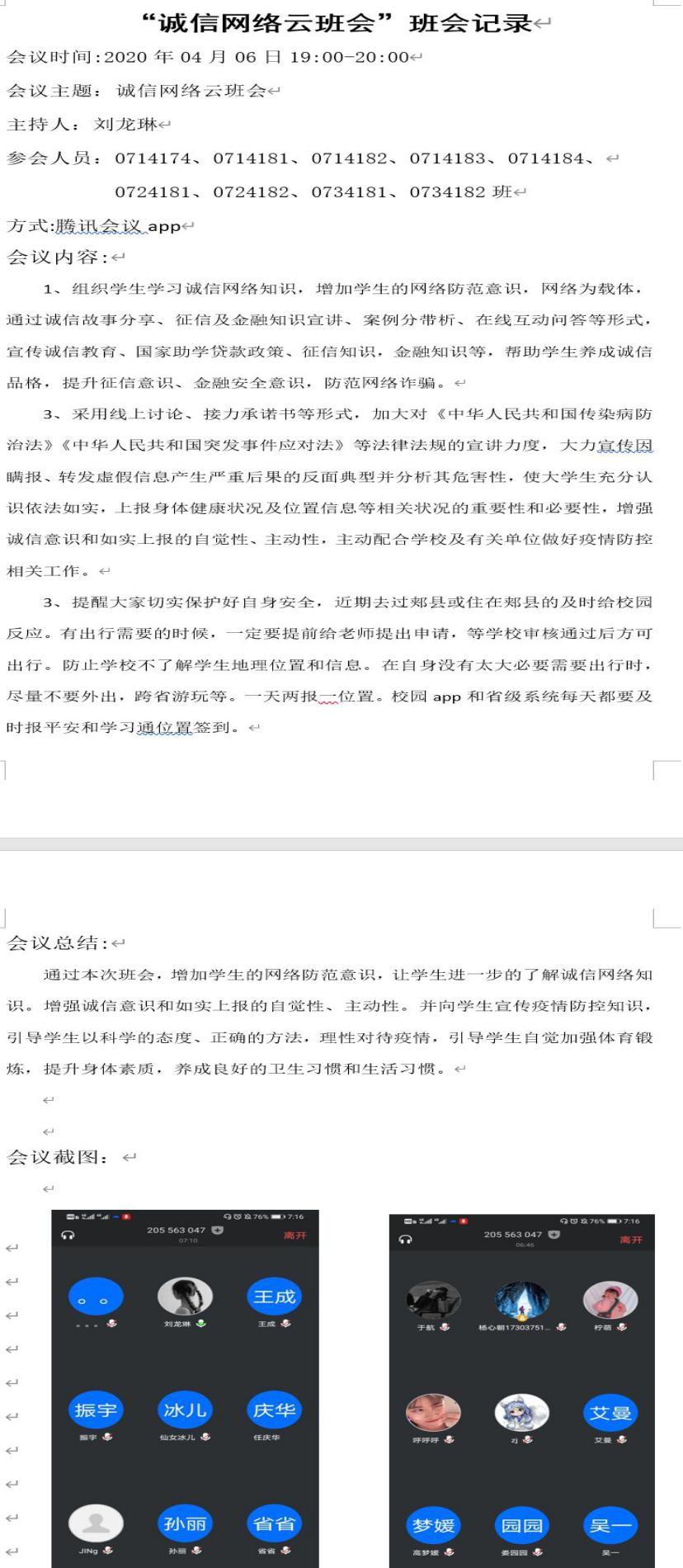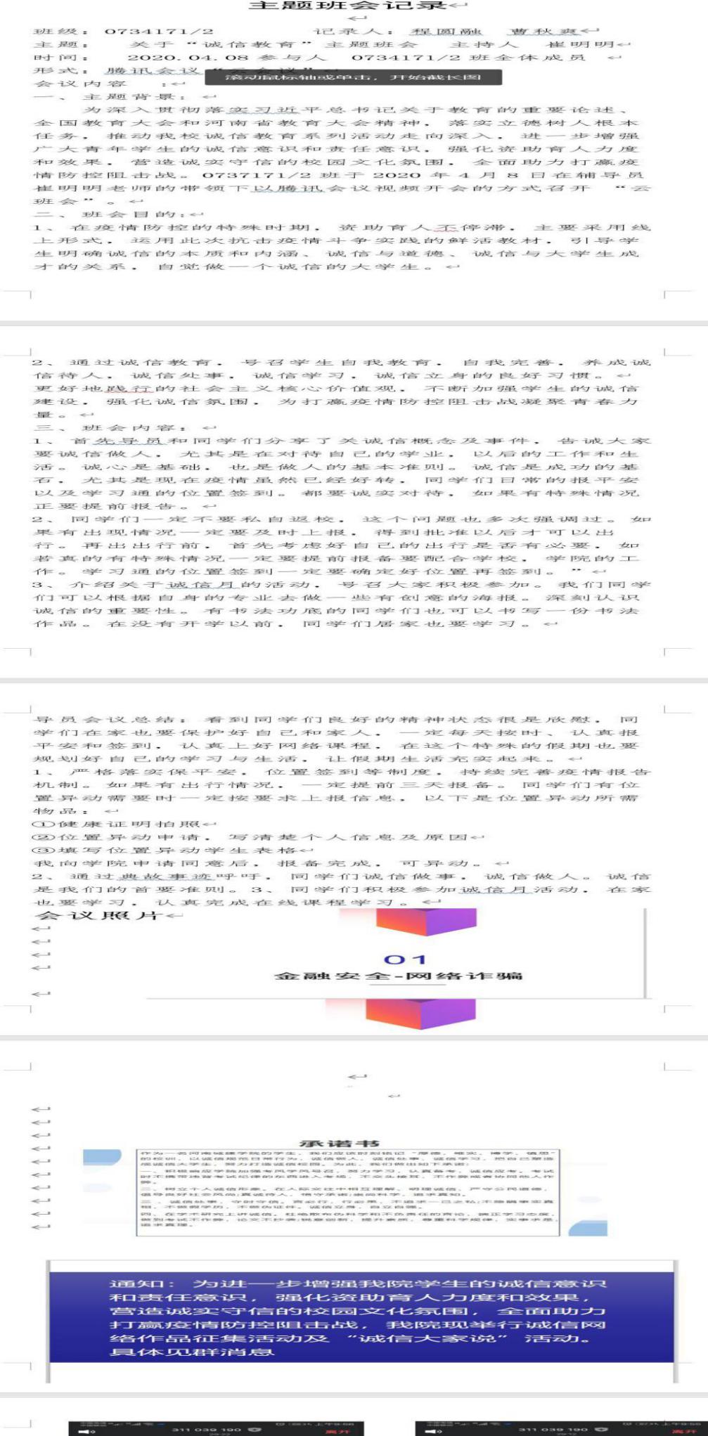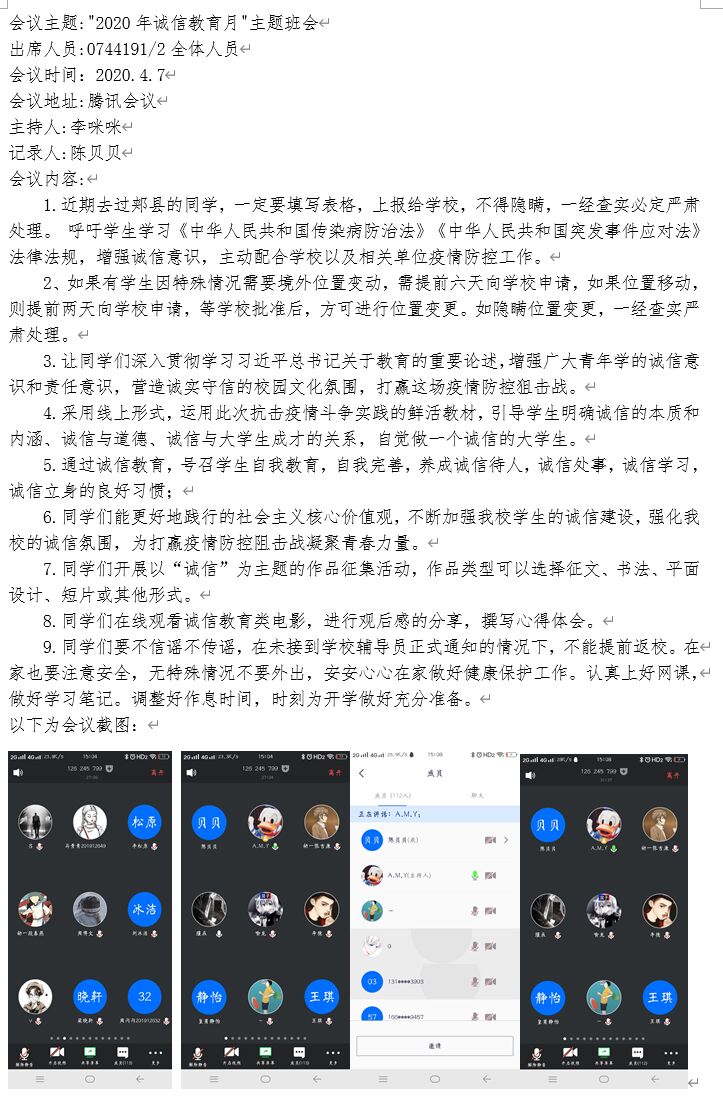 XC体育于2020年4月1日——2020年4月8日特开展“诚信云班会”,在各位辅导员老师的带领下开展以“坚守诚信,助推青春”为主题的教育班会,并采用线上讨论、接力承诺书等形式,在这个特殊时期加大对法律法规的宣讲力度,让同学们充分认识到如实上报健康信息的必要性与重要性,进一步增强同学们的诚信意识和责任意识,营造诚实守信的校园氛围。