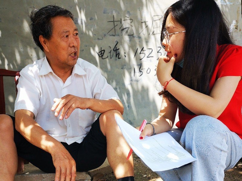 图为志愿者向村民询问村子近几年的特色农业发展状况并向村民讲解当今国家对于农民的补贴和帮扶政策。