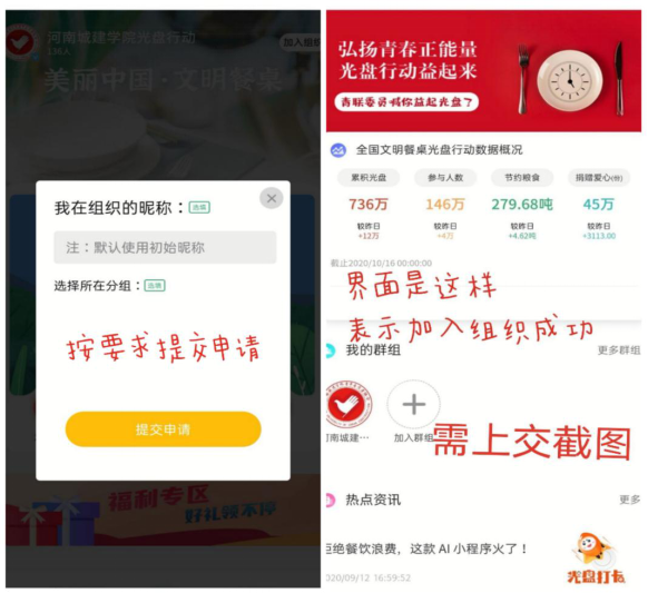 活动期间,员工们首先要通过光盘行动的微信小程序申请加入XC体育的志愿群组并且进行光盘行动的打卡,每一位员工都积极踊跃参加光盘行动打卡获得积分,并将所得积分进行爱心捐赠。活动不仅使员工们时刻谨记“谁知盘中餐,粒粒皆辛苦”中劳动者的辛勤,还能够让员工们养成节约粮食的好习惯,更让爱心充满校园,充满社会。让这个节约粮食的好习惯持续传递下去。