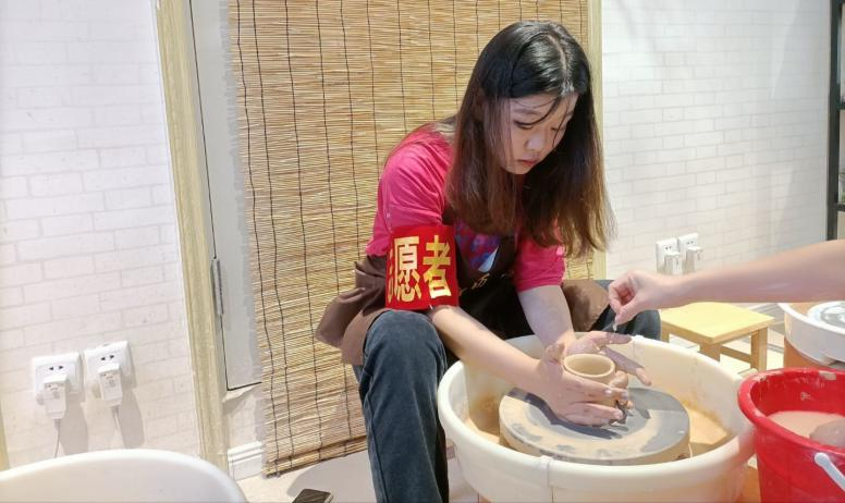 图为志愿者认真体验陶艺制作过程