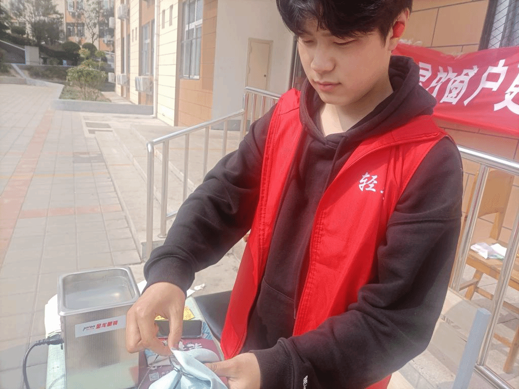 图为志愿者认真清洁眼镜