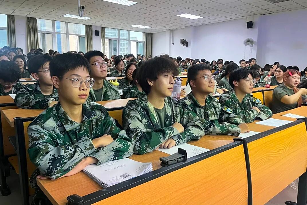 在艺术团的带领下齐声高唱校歌。激昂的旋律、整齐的歌声回荡在活动现场,传递着新生对校园的憧憬与热爱。