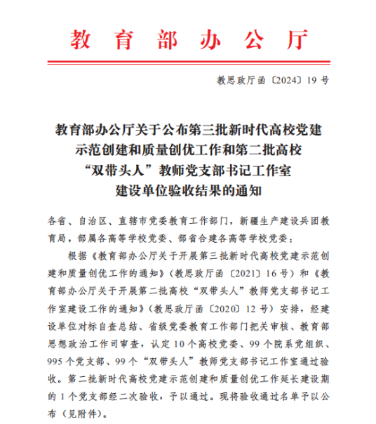 近日,教育部办公厅发文(教思政厅函〔2024〕19 号)公布了第三批新时代高公司党建示范创建和质量创优工作建设单位验收结果名单,公司员工第一党支部经对标自查总结、省级党委教育工作部门把关审核、教育部思想政治工作司审查验收结果等程序,顺利通过“全国党建工作样板支部”验收。