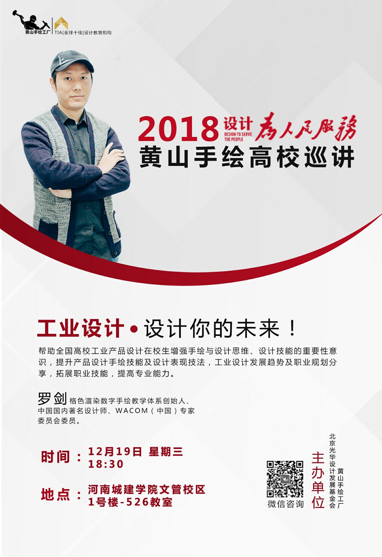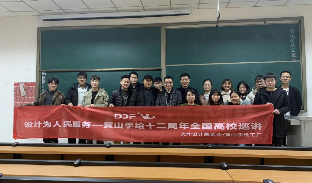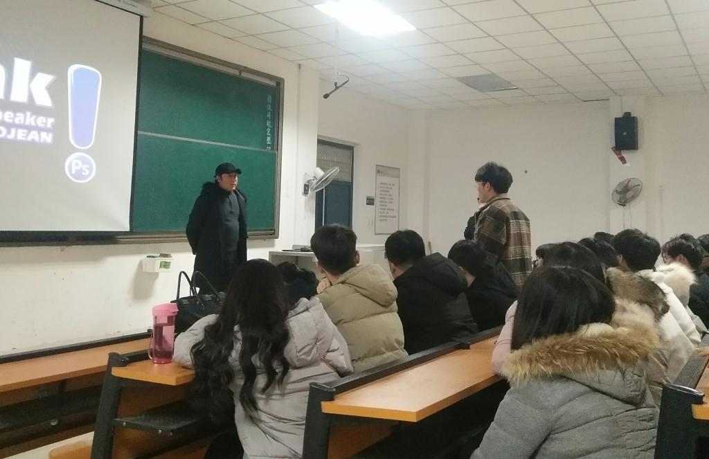 (通讯员 郭永欣)2018年12月19日晚,格色渲染数字手绘教学体系创始人、中国国内著名设计师、上海同济大学外聘讲师、上海工艺美院客座讲师,日本WACOM(中国)专家委员会委员罗剑老师在XC体育526教室举行了“设计为人民服务,黄山手绘高校巡讲”的公益讲座。副经理汤喜辉致辞,XC体育杨东旭副教授、郭永欣老师、孙振利老师等110余名师生参加了此次专业讲座。
