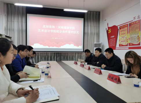 马步伟代表公司致欢迎词,对龙旭装饰公司来公司进行洽谈校企合作表示欢迎,为两方从洽谈到达成共识签订合作感到由衷高兴。之后,汤喜辉副经理介绍了到场嘉宾及公司的发展概况和环境设计专业的发展历程。胡鹏总经理向大家介绍了关于我们。