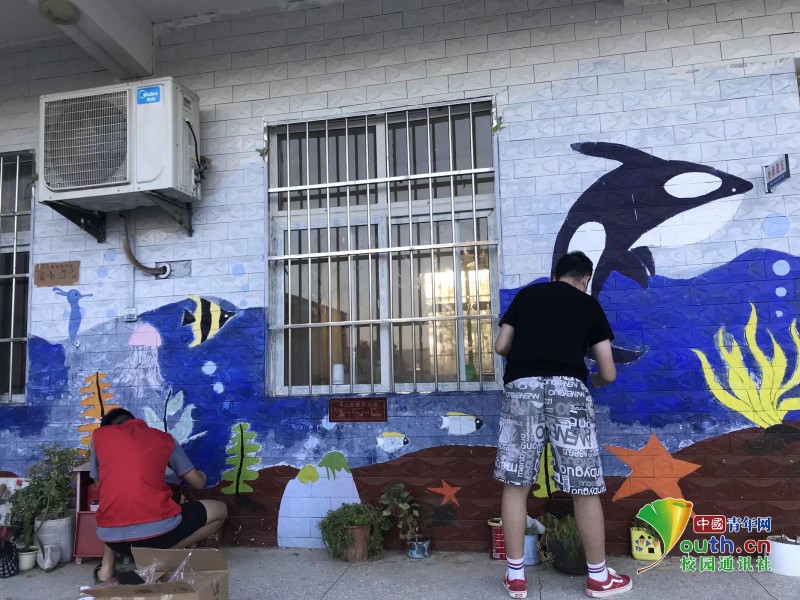 图片为志愿者为扶贫村庄画墙绘添彩。