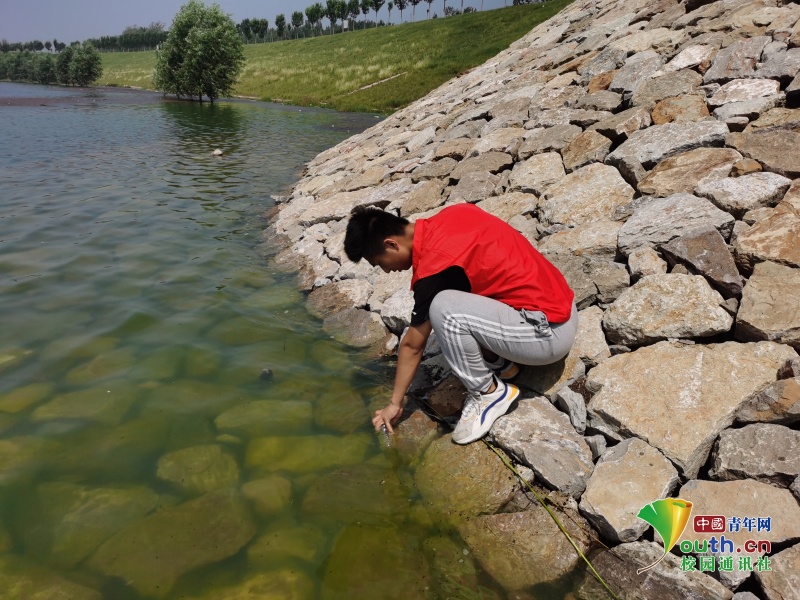 图为实践队员在金堤河河堤学习观看宣传栏了解河长制。