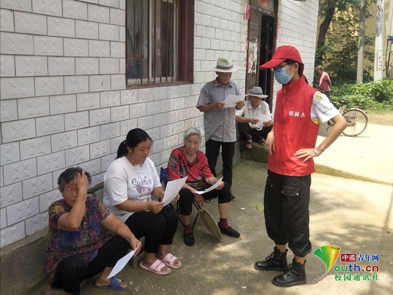图为实践队员向沿岸村民发放宣传资料,为当地村民讲解水资源保护知识。