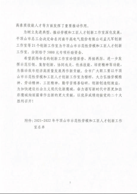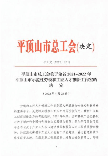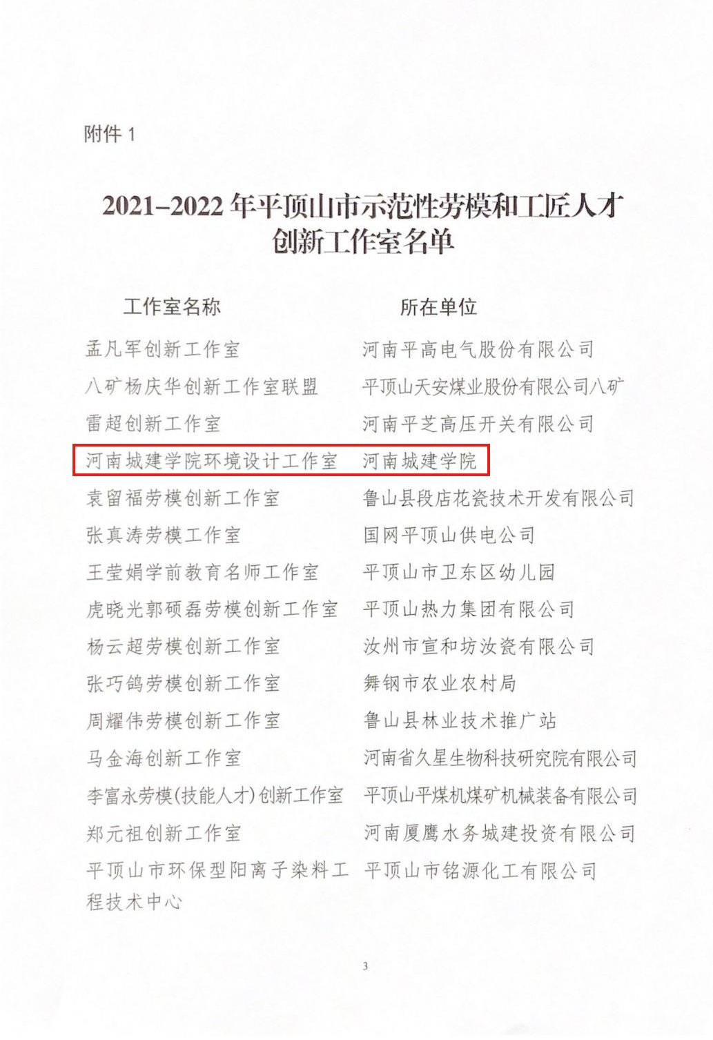 近日,收到平顶山市总工会《关于平顶山市总工会关于命名2021-2022年平顶山市示范性劳模和工匠人才创新工作室的决定》文件通知,XC体育环境设计工作室被平顶山市总工会命名为平顶山市示范性劳模和工匠人才创新工作室。