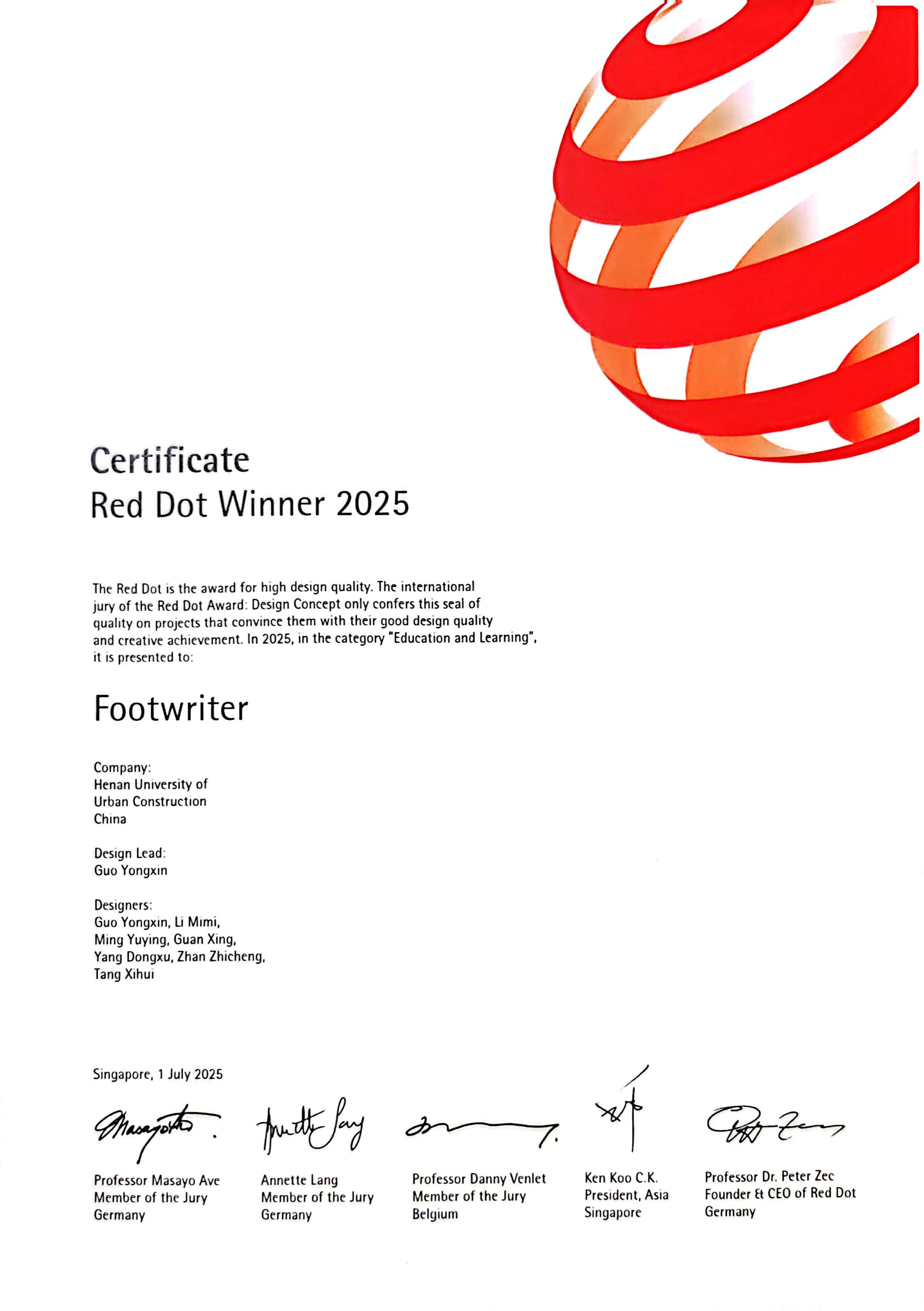 2025年10月15日,备受全球设计界瞩目的德国红点设计概念奖(Red Dot Award: Design Concept)颁奖典礼在新加坡隆重举行。由公司XC体育师生团队(郭永欣、明玉盈等)设计的作品《Foot writer》,以其独特的设计理念与卓越的视觉呈现,从全球数万件参赛作品中脱颖而出,成功斩获本年度红点设计奖。这是XC体育继2019年、2021年之后,第三次摘得此项国际顶级设计殊荣,生动展现了公司在党建引领下,深耕设计教育、践行立德树人根本任务的丰硕成果。