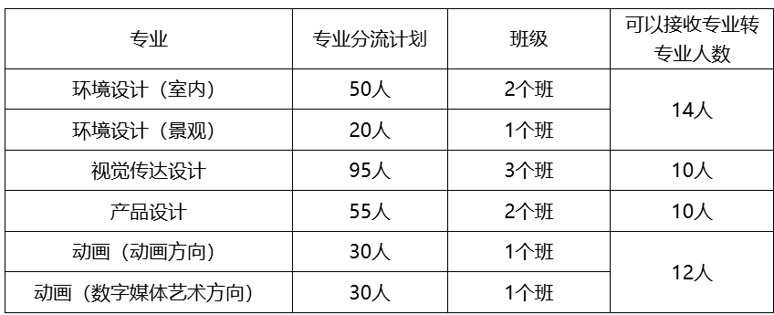根据设计学类、动画专业分流结果,制定各专业(方向)可以接纳的转专业人数。