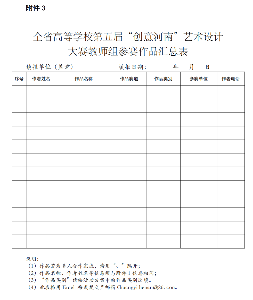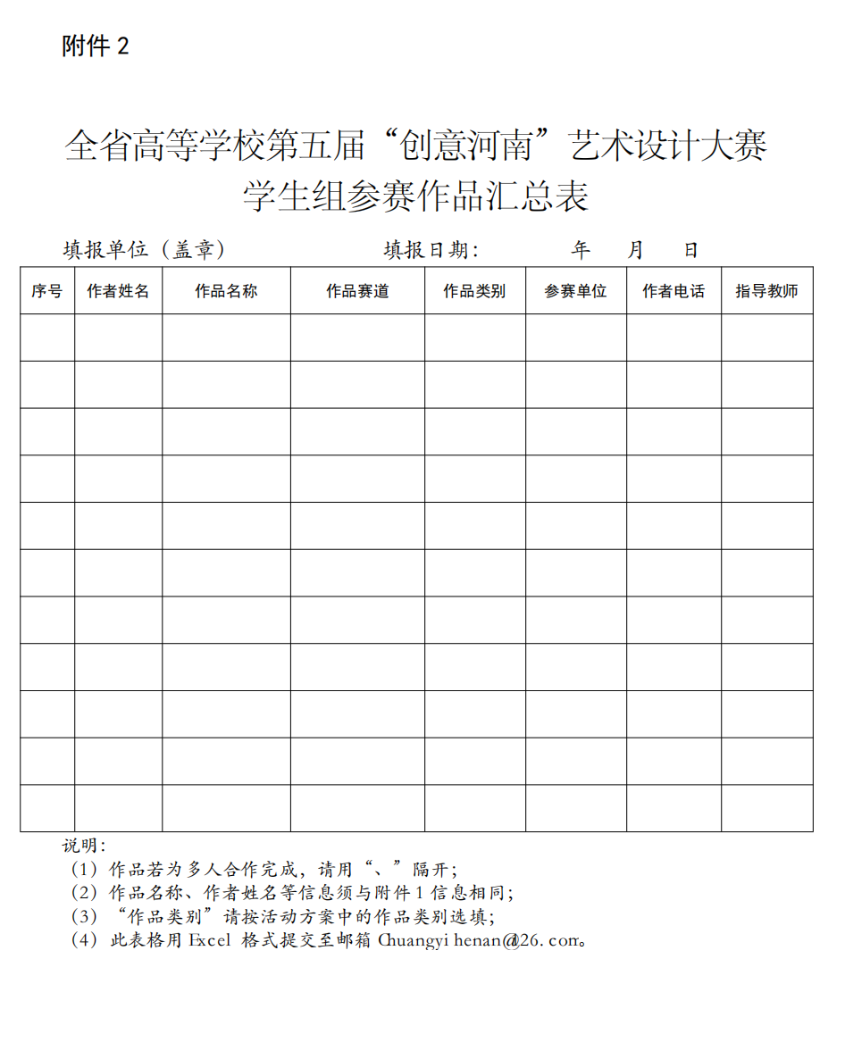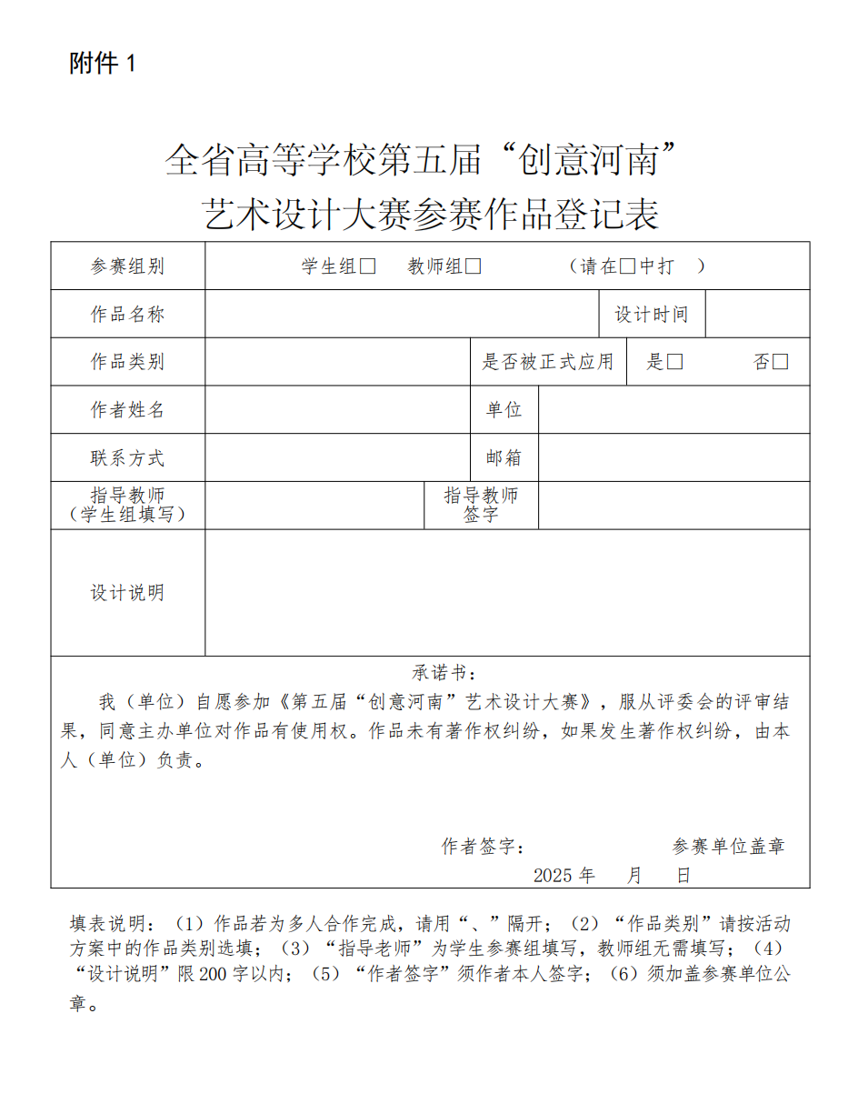 附件:1.全省高等公司第五届“创意河南”艺术设计大赛参赛作品登记表