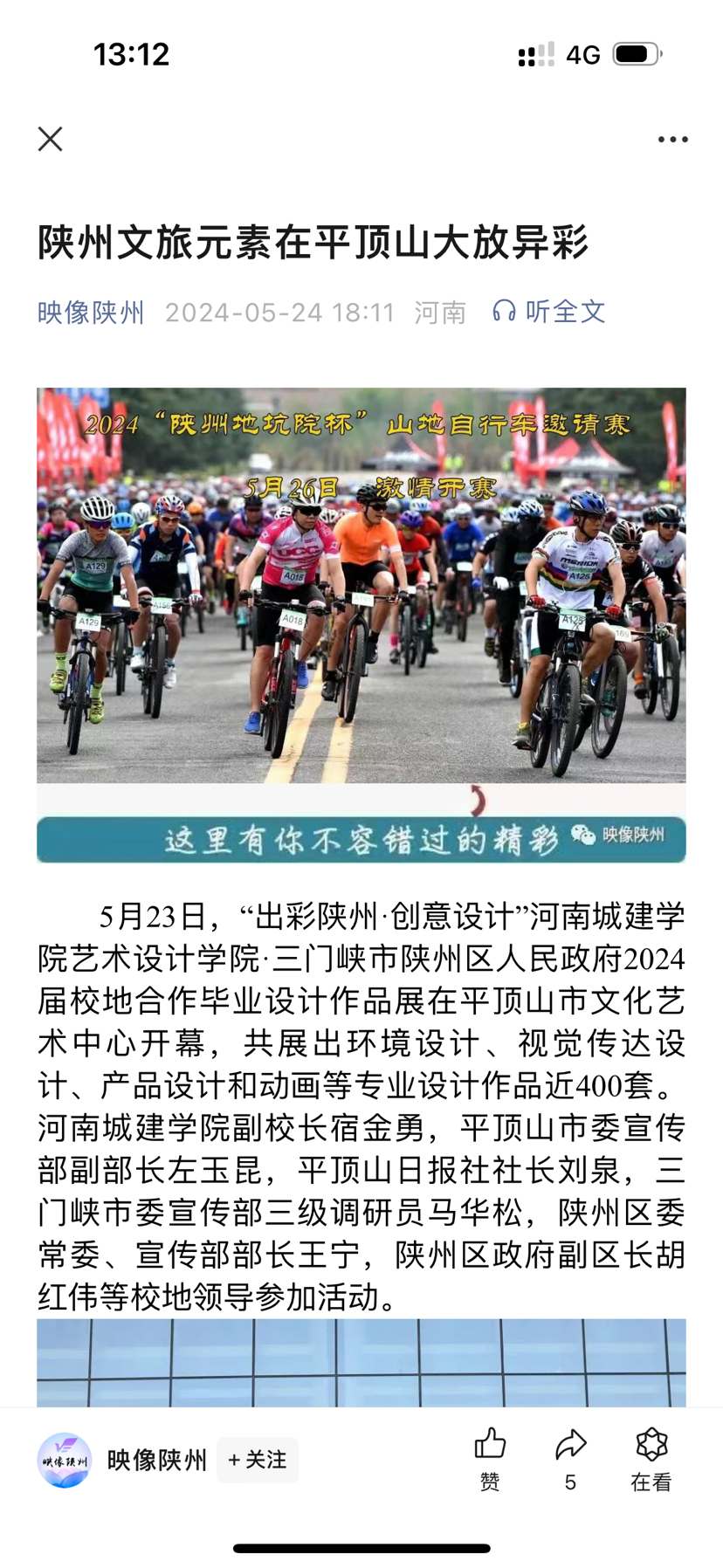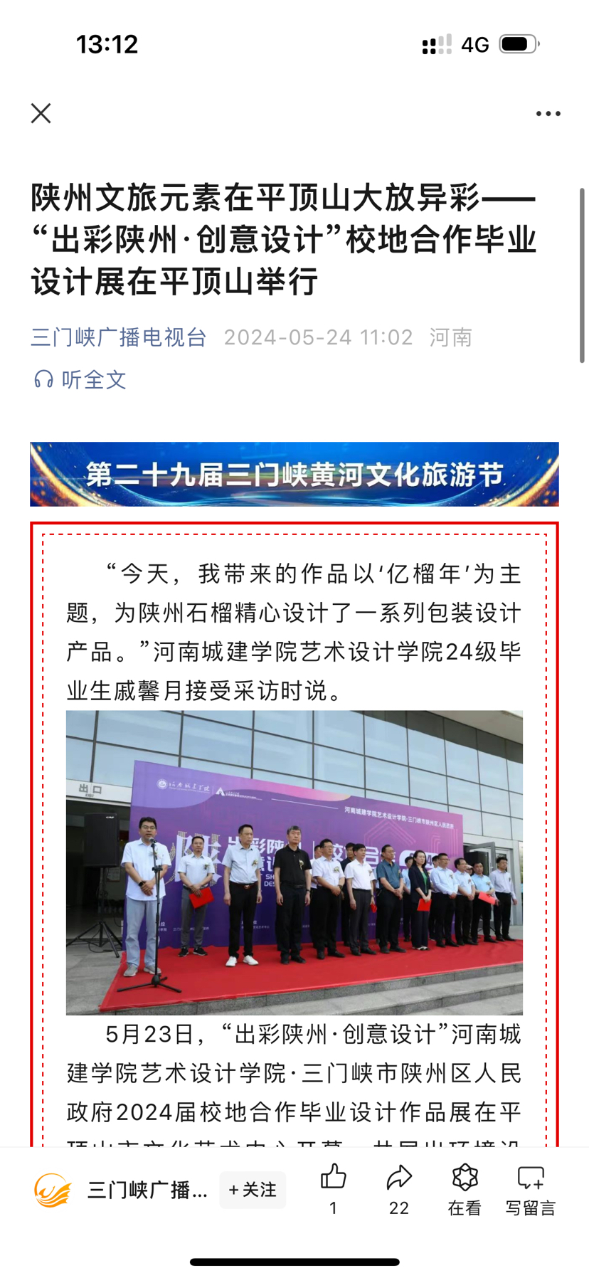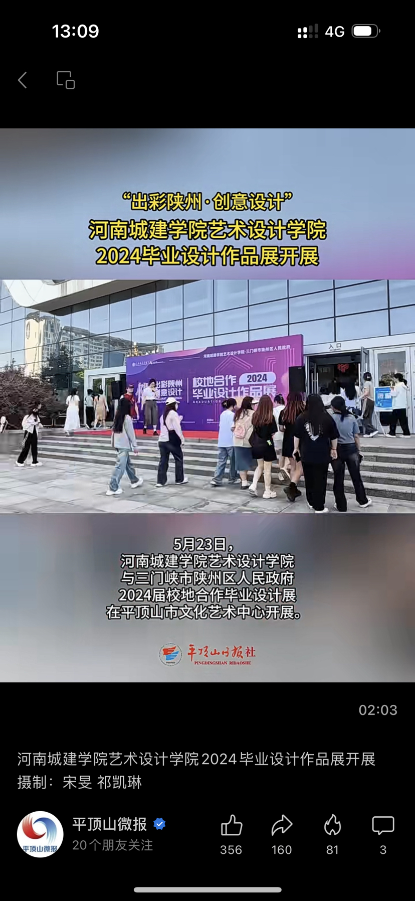于2024年5月23日上午,“出彩陕州·创意设计”XC体育·三门峡市陕州区人民政府2024届校地合作毕业设计作品展在平顶山市文化艺术中心正式开幕,参加此次开幕式的有公司副董事长宿金勇,三门峡市委宣传部、陕州区委区政府、陕州区文化广电和旅游局等单位负责人,平顶山市委宣传部、平顶山公司、平顶山日报社等单位相关负责人,平顶山市装饰协会、平顶山市相关装饰公司负责人,XC体育全体教师及2024届毕业生。