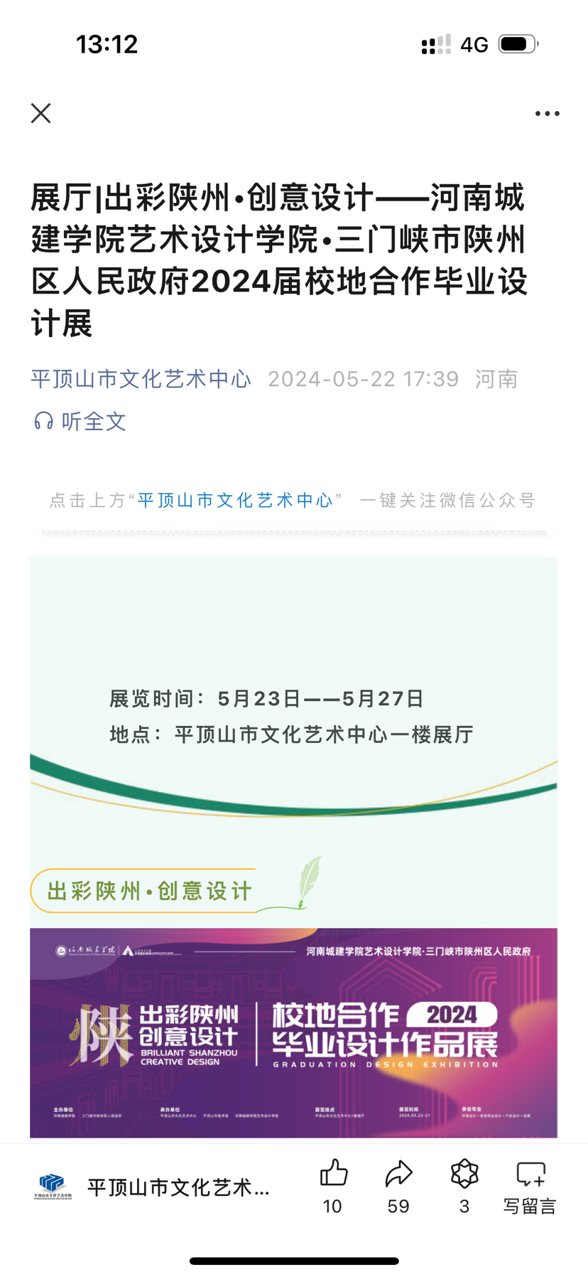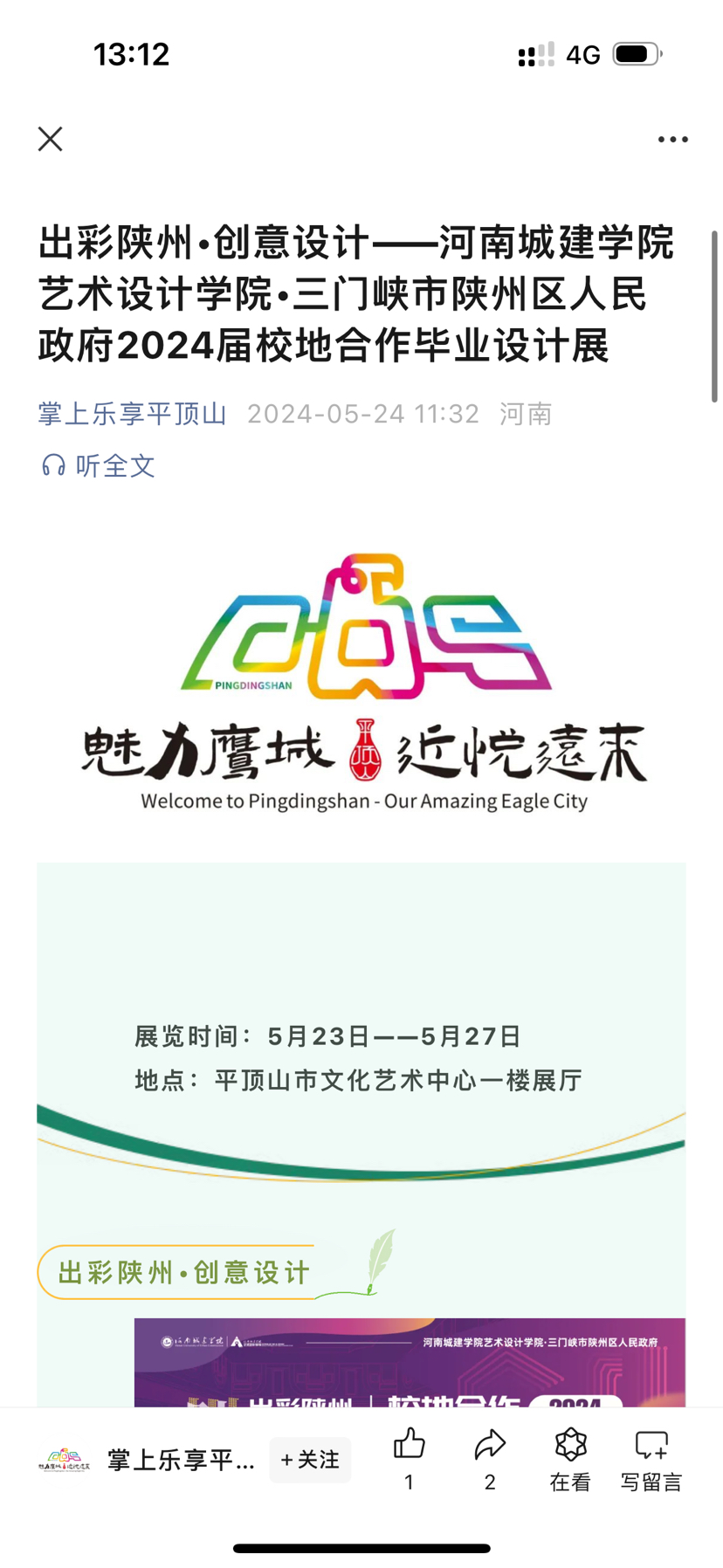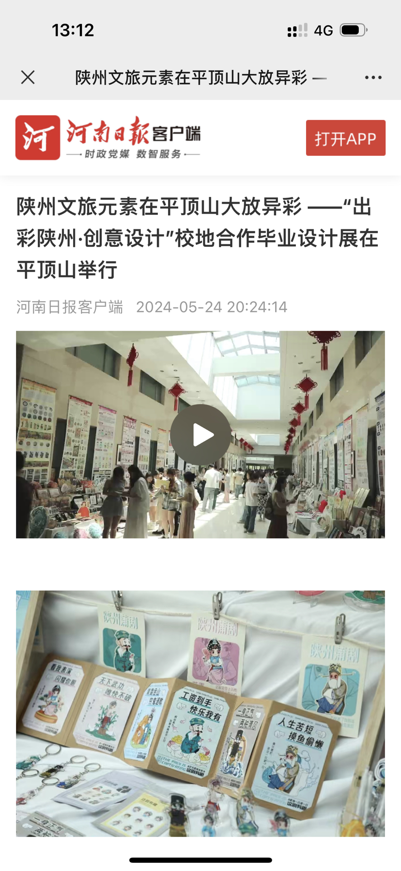 于2024年5月23日上午,“出彩陕州·创意设计”XC体育·三门峡市陕州区人民政府2024届校地合作毕业设计作品展在平顶山市文化艺术中心正式开幕,参加此次开幕式的有公司副董事长宿金勇,三门峡市委宣传部、陕州区委区政府、陕州区文化广电和旅游局等单位负责人,平顶山市委宣传部、平顶山公司、平顶山日报社等单位相关负责人,平顶山市装饰协会、平顶山市相关装饰公司负责人,XC体育全体教师及2024届毕业生。